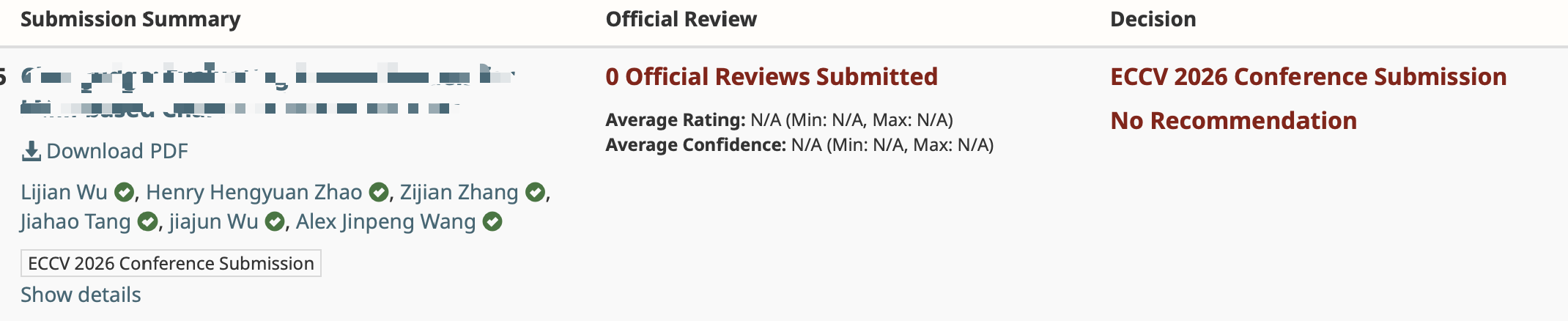 - 2026.03: 🔥 In collaboration with Lijian Wu (Admitted Ph.D. student, CSU) under the leadership of Prof. Alex Jinpeng Wang, we submitted a paper to ECCV 2026 and I acted as the co-author (ECCV 2026 Submission).