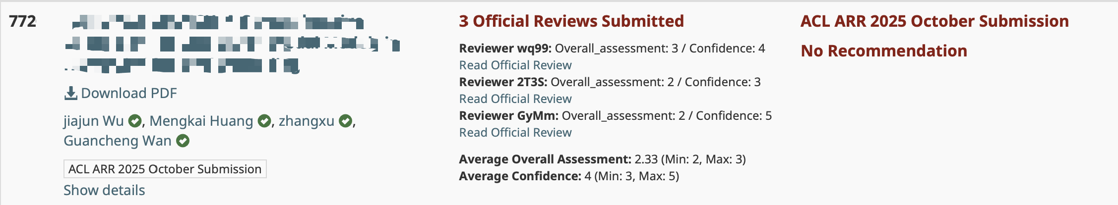 - 2025.10: 😔 In collaboration with Guancheng Wan (Ph.D., UCLA), we submitted our first paper to the ARR 10th Round (target venue: ACL2026) and I served as the first author (rating: 2.33/5). We plan to refactor and resubmit to EMNLP 2026 via ARR in May.