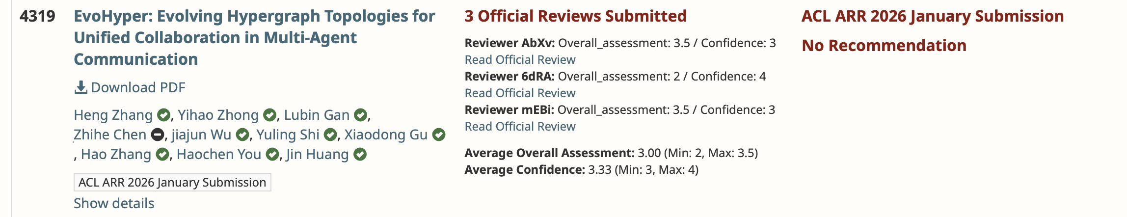 - 2026.01: 🎉 In collaboration with Heng Zhang (M.S., SCNU), we submitted a paper to ACL 2026 and I acted as the co-author (rating: 3/5, likely to be accepted by ACL Findings).