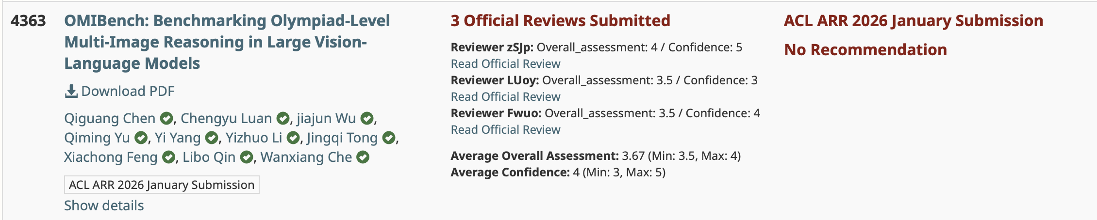 - 2026.01: 🎉 In collaboration with Qiguang Chen (Ph.D., Harbin Institute of Technology) under the leadership of Prof. Libo Qin and Prof. Wanche Xiang (Professor at HIT), we submitted a paper to the ARR January Round (target venue: ACL 2026) and I acted as the co-first author (3rd position) (rating: 3.67/5, likely to be accepted by ACL main).